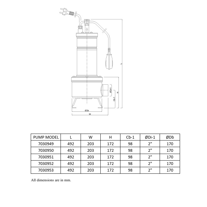 Pumpen levereras med 10 m H07RN-F-strömkabel (enfas med kontakt) och kan installeras fast eller bärbart i vertikalt läge. Den klarar upp till 7 m nedsänkningsdjup och lämpar sig för bostadsavlopp med fasta partiklar upp till 50 mm.