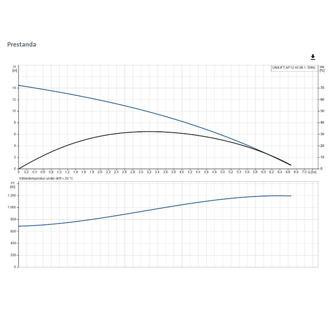 Pumpen levereras färdig för användning med bärhandtag och 10 m motorkabel, där kabelinfästningen är förseglad med glasmaterial för att förhindra fuktintrång i motorlindningen.