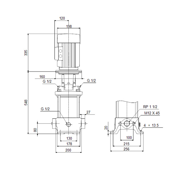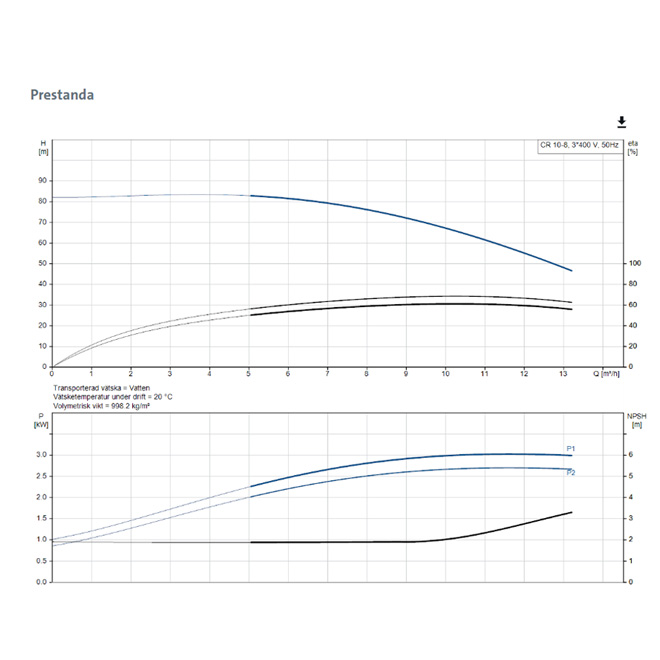 Vertikal flerstegspump med centrifugalprincip, där både sug- och tryckanslutningar är placerade på samma nivå (inline). Pumpkroppen och basen är tillverkade i gjutjärn, medan alla vätskeberörda komponenter består av rostfritt stål. Pumpen har en patrontätning som garanterar säker drift, hög pålitlighet och smidig åtkomst vid service. Kraften överförs via en delad koppling, och pumpen drivs av en tre-fas fotmonterad asynkronmotor med fläktkylning.