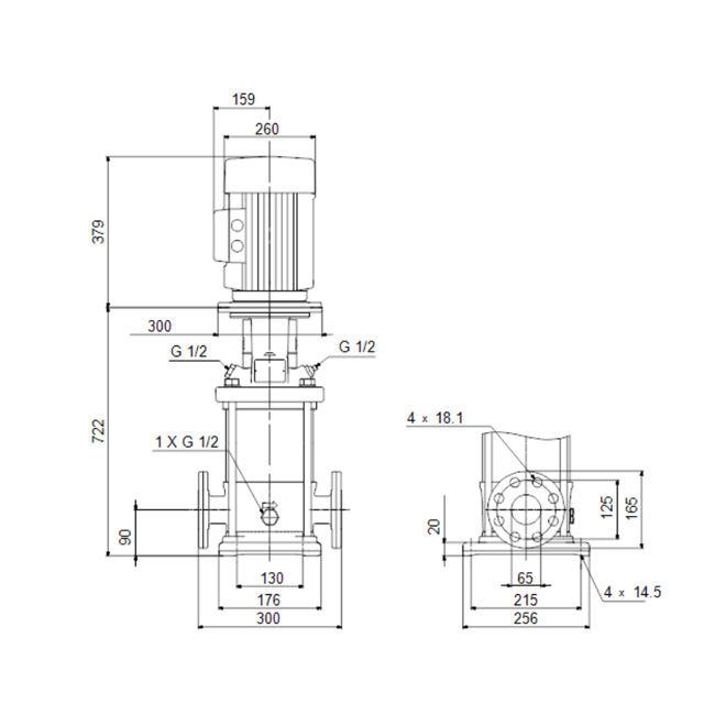 Denna vertikala flerstegs centrifugalpump är utformad med sug- och tryckanslutningar på samma nivå (inline) för smidig installation. Pumpkroppen och underdelen är tillverkade i slitstarkt gjutjärn, medan alla delar som kommer i kontakt med vätskan består av rostfritt stål för maximal hållbarhet. En patrontätning ger hög driftsäkerhet, trygg drift och enkel åtkomst vid service. Kraftöverföringen sker via en delad koppling, och röranslutningen är utformad med DIN-flänsar. Pumpen drivs av en tre-fas fotmonterad asynkronmotor med fläktkylning för effektiv och stabil drift.
