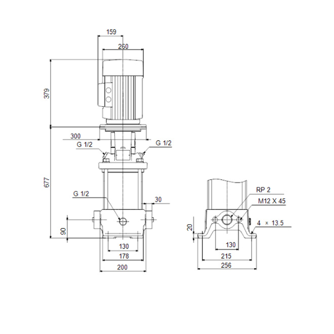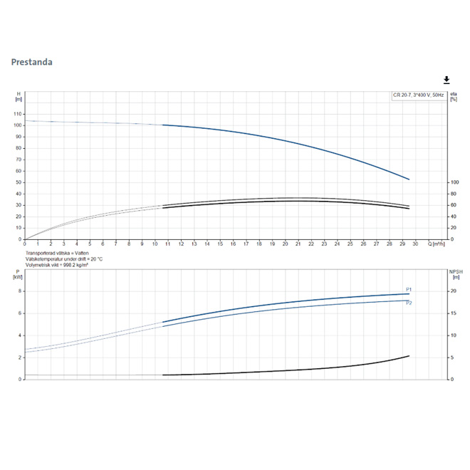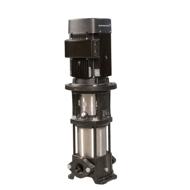 Den vertikala flerstegs centrifugalpumpen är utformad med sug- och tryckportar placerade på samma nivå (inline), vilket ger en kompakt och effektiv konstruktion. Pumpens hus och underdel är tillverkade i robust gjutjärn, medan samtliga vätskeberörda komponenter består av rostfritt stål för ökad hållbarhet och korrosionsskydd. En patrontätning bidrar till hög driftsäkerhet, trygg drift och enkel åtkomst vid service. Kraftöverföringen sker via en delad koppling, och pumpen drivs av en tre-fas fotmonterad asynkronmotor med fläktkylning för pålitlig och energieffektiv drift.
