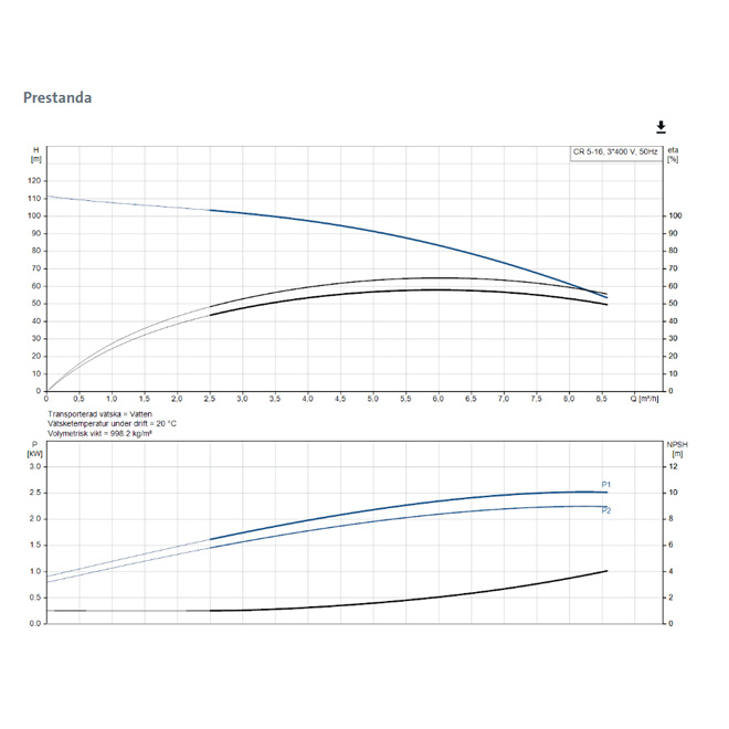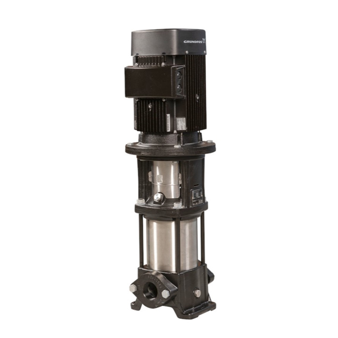 Vertikal, flerstegs centrifugalpump med in- och utloppsanslutningar placerade i linje för kompakt installation. Pumpens hus och bas är tillverkade i gjutjärn, medan samtliga vätskeberörda komponenter består av rostfritt stål för optimal hållbarhet. En patronmonterad tätning ger hög driftsäkerhet, enkel service och säker hantering. Kraftöverföringen sker via en delad koppling, och pumpen drivs av en robust, trefasig, fotmonterad asynkronmotor med fläktkylning.