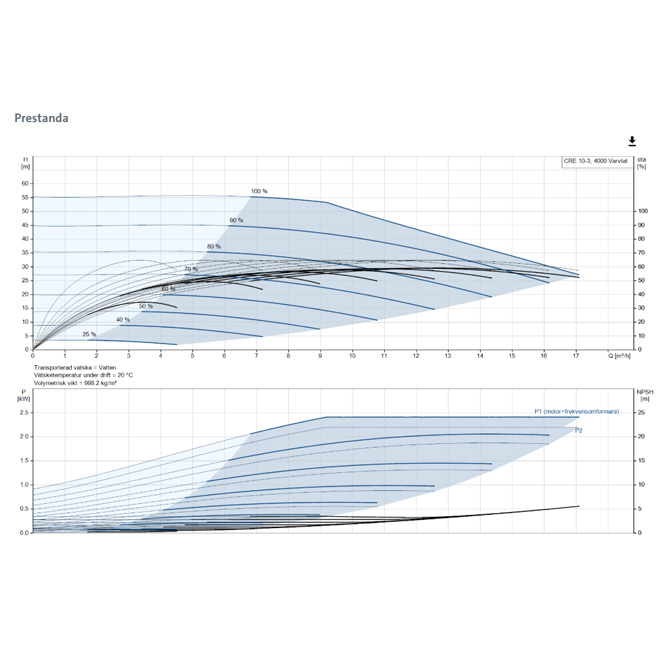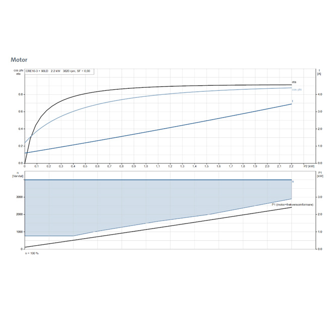 Pumpen drivs av en trefasig, fläktkyld permanentmagnet-synkronmotor med verkningsgrad motsvarande IE5 enligt standarden IEC 60034-30-2. Motorn är utrustad med en integrerad frekvensomriktare och en PI-regulator i kopplingsboxen, vilket möjliggör steglös varvtalsstyrning och därmed optimering av pumpens prestanda efter aktuellt behov.