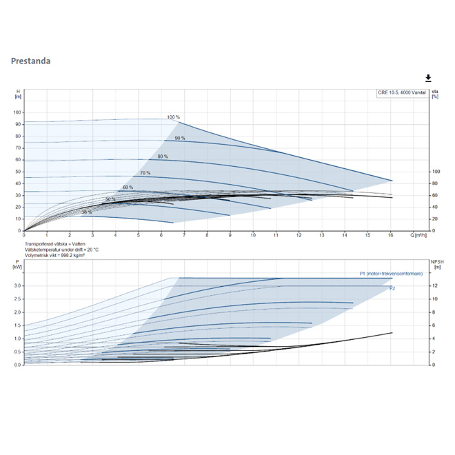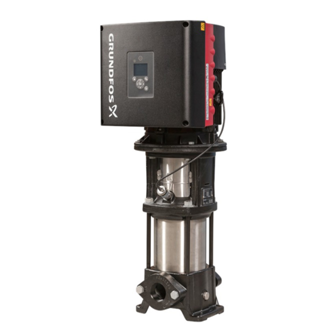 Den vertikala flerstegs centrifugalpumpen har både inlopps- och tryckanslutningar placerade på samma nivå (inline), vilket ger en kompakt och installationsvänlig konstruktion. Pumpkropp och underdel är tillverkade i hållbart gjutjärn, medan alla vätskeberörda delar är utförda i rostfritt stål för hög korrosionsbeständighet. En patrontätning garanterar driftsäkerhet, säker hantering och enkel åtkomst vid service.