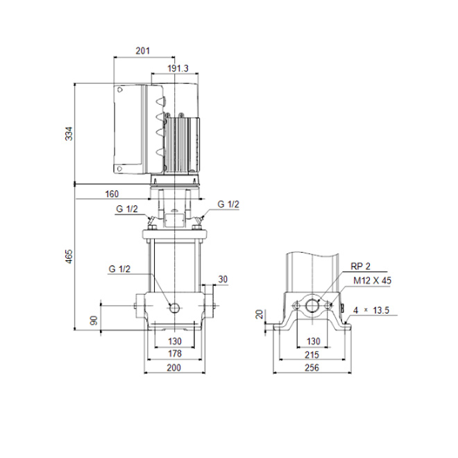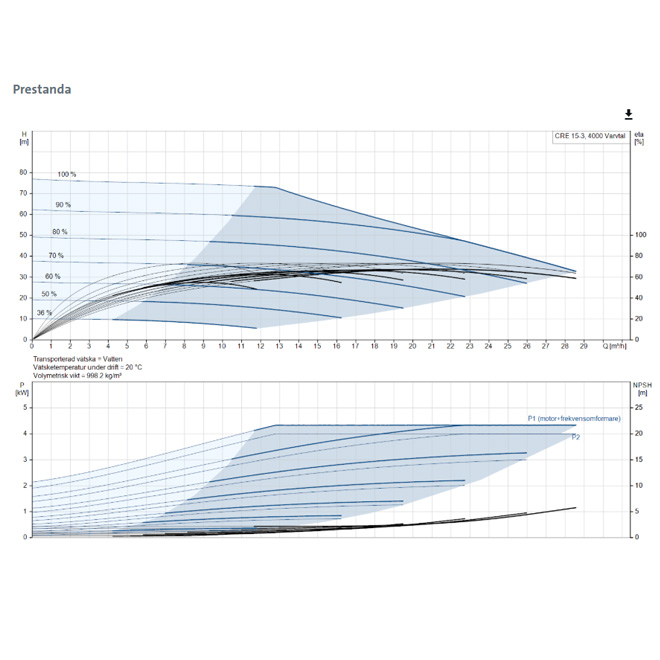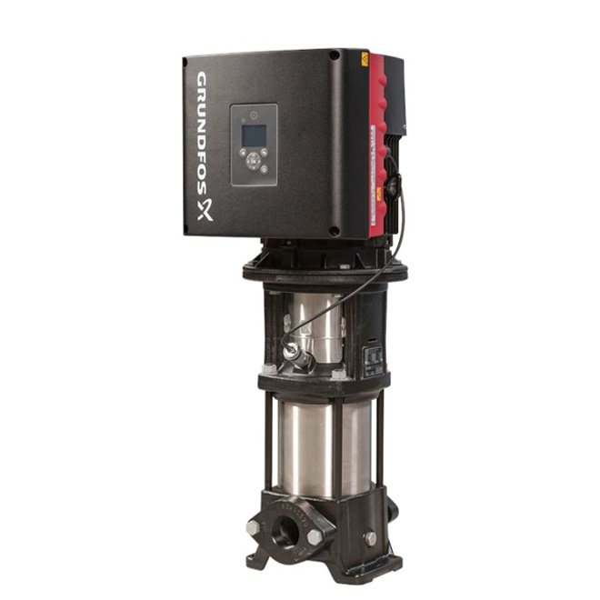 Den vertikala flerstegs centrifugalpumpen är konstruerad med inlopps- och tryckportar placerade på samma nivå (inline), vilket ger en kompakt och effektiv installation. Pumpens hus och bas är tillverkade i gjutjärn, medan alla vätskeberörda komponenter består av rostfritt stål för ökad hållbarhet och korrosionsbeständighet. En patrontätning bidrar till hög driftsäkerhet, trygg drift och enkel serviceåtkomst.