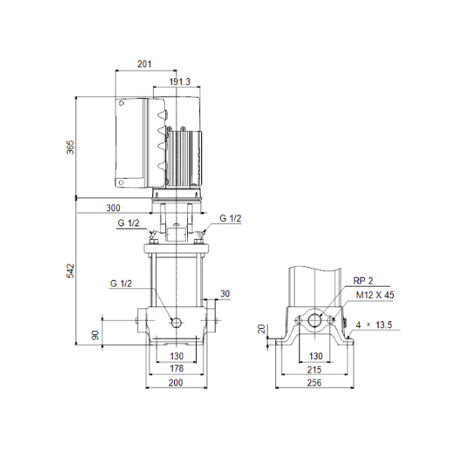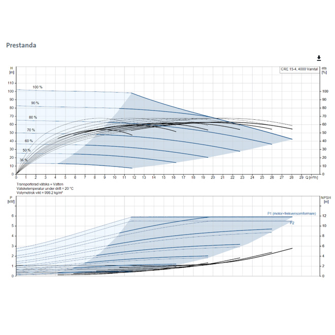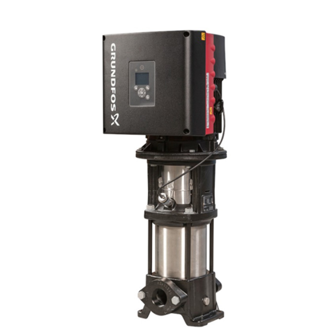 Den vertikala flerstegs centrifugalpumpen har sug- och tryckanslutningar på samma nivå (inline), vilket ger en kompakt och enkel installation. Pumpkroppen och underdelen är tillverkade i robust gjutjärn, medan alla vätskeberörda delar är gjorda av rostfritt stål för maximal hållbarhet och korrosionsskydd. En patrontätning säkerställer driftsäkerhet, trygg hantering och enkel åtkomst vid service.