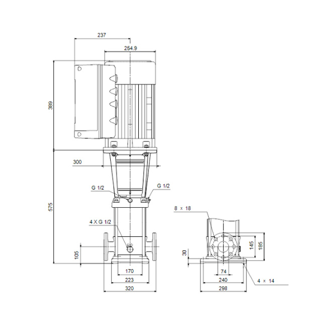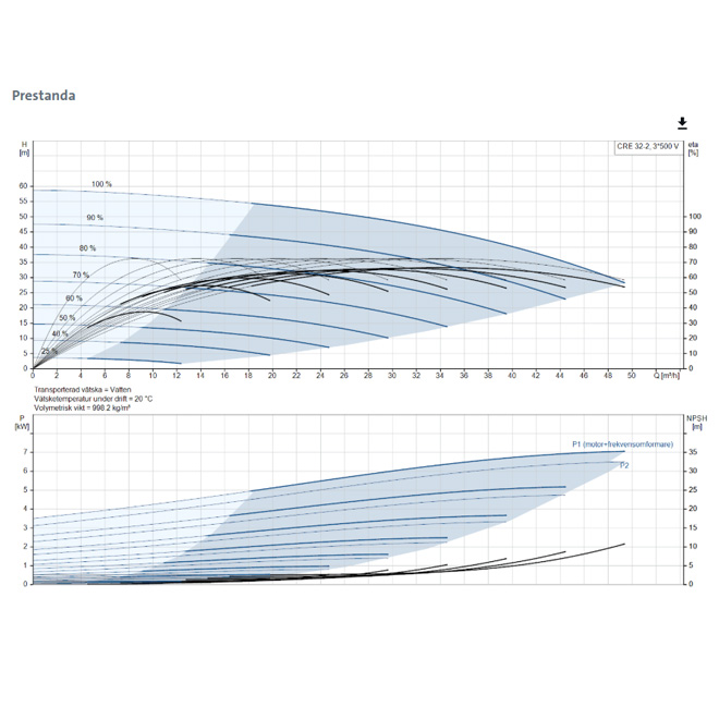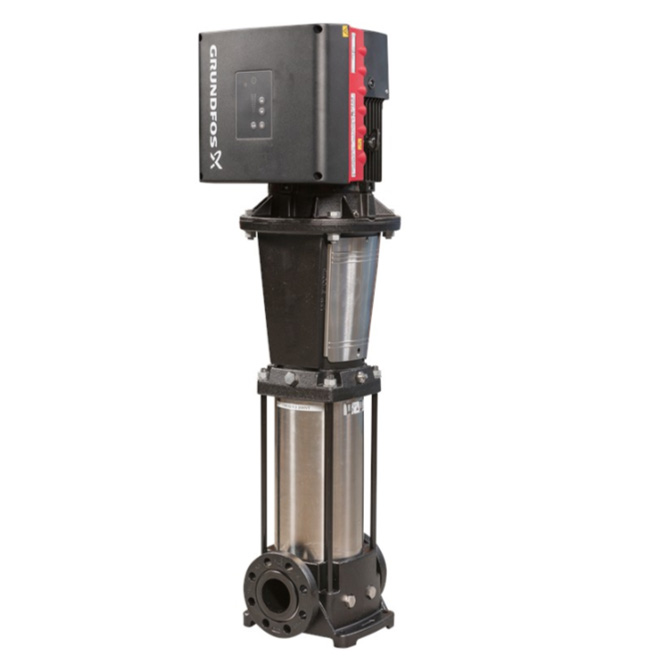 Den vertikala flerstegs centrifugalpumpen har sug- och tryckanslutningar på samma nivå (inline), vilket ger en kompakt och enkel installation. Pumpkroppen och underdelen är tillverkade i slitstarkt gjutjärn, medan alla vätskeberörda delar består av rostfritt stål för hög korrosionsbeständighet och lång livslängd. En patrontätning säkerställer hög driftsäkerhet, trygg hantering och enkel åtkomst vid service.