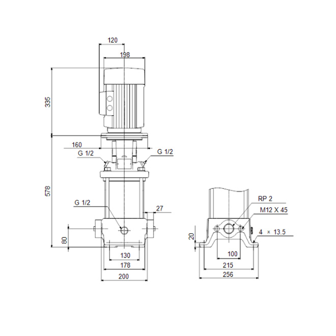 Vertikal flerstegspump med centrifugalprincip, där både sug- och tryckanslutningar är placerade på samma nivå (inline). Pumpkroppen och basen är gjorda av gjutjärn, medan övriga delar som kommer i kontakt med vätskan är i rostfritt stål. Pumpen har en patrontätning som garanterar säker drift, hög tillförlitlighet och enkel åtkomst vid underhåll. Kraftöverföringen sker via en delad koppling, och pumpen drivs av en tre-fas fotmonterad motor.