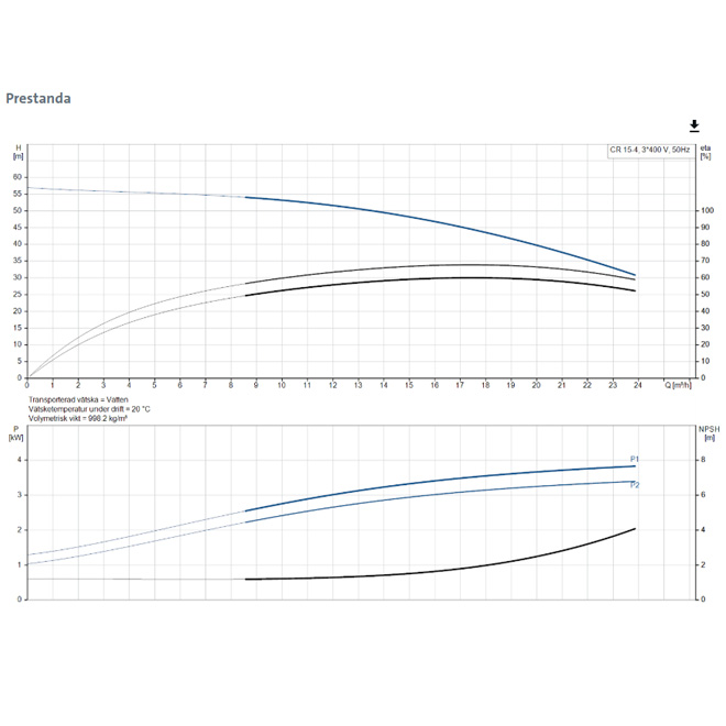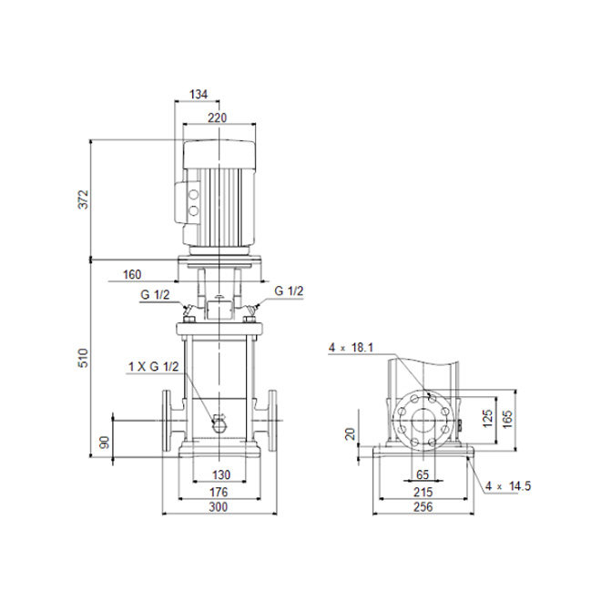 Vertikal flerstegs centrifugalpump med sug- och tryckanslutningar på samma nivå (inline). Pumpens kropp och bas är tillverkade i gjutjärn, medan alla delar som kommer i kontakt med vätskan är i rostfritt stål. Patrontätningen säkerställer driftsäkerhet, säker hantering och enkel åtkomst vid service. Kraftöverföringen sker via en delad koppling, och pumpen drivs av en tre-fas fotmonterad asynkronmotor med fläktkylning.