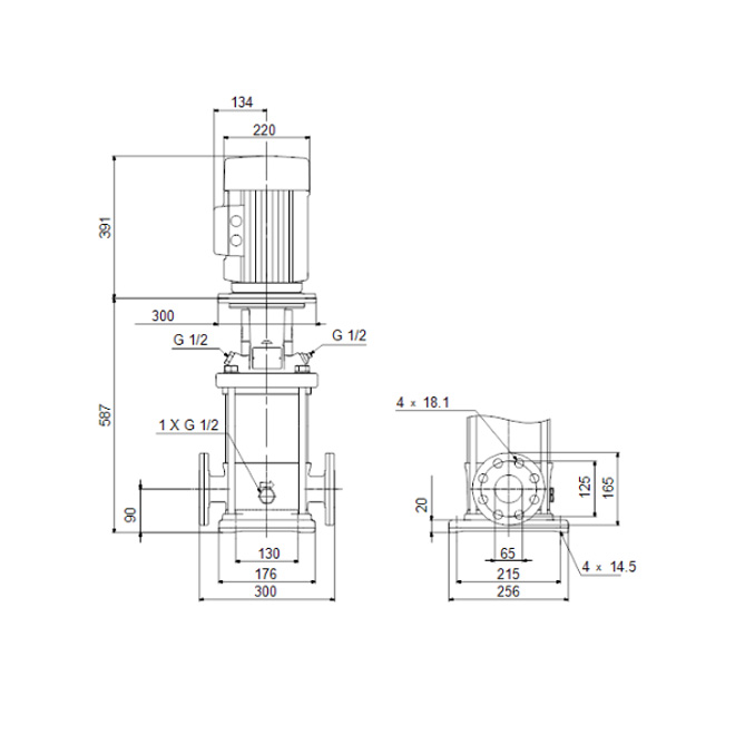 Den vertikala flerstegspumpen med centrifugalprincip är konstruerad med sug- och tryckportar på samma nivå (inline), vilket ger en kompakt och platsbesparande installation. Pumpens hus och bottensektion är tillverkade i gjutjärn, medan samtliga vätskeberörda delar består av rostfritt stål för ökad livslängd och korrosionsmotstånd. En patrontätning bidrar till hög driftsäkerhet, säker hantering och enkel service. Kraftöverföringen sker genom en delad koppling, och röranslutningen är utrustad med DIN-flänsar. Pumpen drivs av en tre-fas, fotmonterad asynkronmotor med fläktkylning för effektiv och stabil drift.