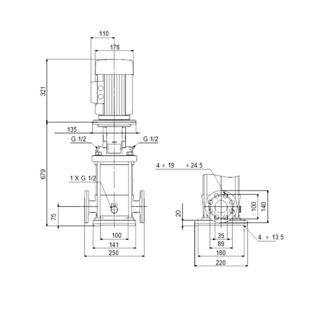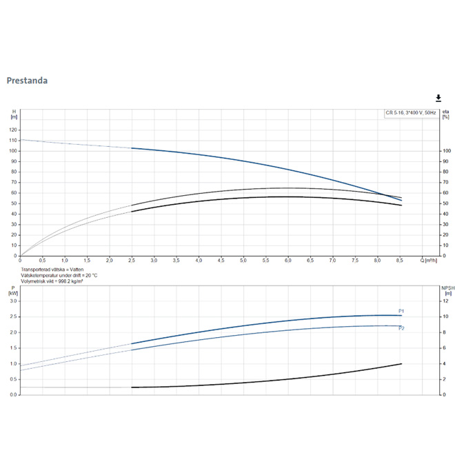 Vertikal, flerstegs centrifugalpump med in- och utloppsanslutningar placerade i linje för kompakt installation. Pumpens hus och bas är tillverkade i gjutjärn, medan samtliga vätskeberörda komponenter består av rostfritt stål för optimal hållbarhet. En patronmonterad tätning ger hög driftsäkerhet, enkel service och säker hantering. Kraftöverföringen sker via en delad koppling, och pumpen drivs av en robust, trefasig, fotmonterad asynkronmotor med fläktkylning.
