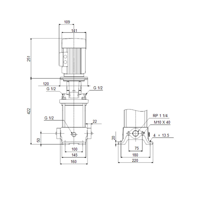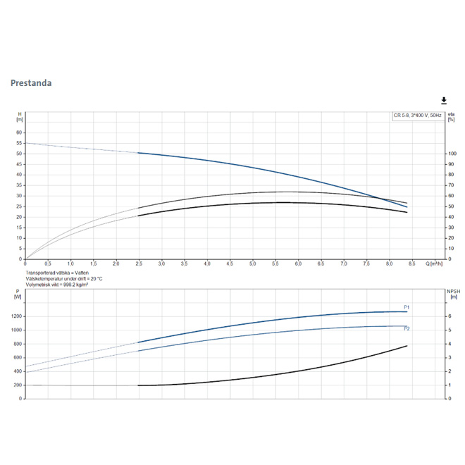 Vertikal, flertrins centrifugalpump med in- och utlopp placerade i linje på samma höjd. Pumpens hus och bas är tillverkade av gjutjärn, medan alla delar som kommer i kontakt med vätskan är av rostfritt stål. En patrontätning ger pålitlig drift, säker hantering och enkel åtkomst vid underhåll. Kraftöverföringen sker via en delad koppling, och pumpen drivs av en fläktkyld, trefasig asynkronmotor med fotmontering.