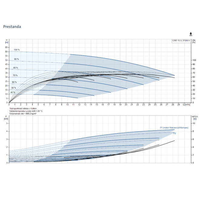 Den vertikala flerstegs centrifugalpumpen är konstruerad med inlopps- och tryckportar placerade på samma nivå (inline), vilket ger en kompakt och effektiv installation. Pumpens hus och bas är tillverkade i gjutjärn, medan alla vätskeberörda komponenter består av rostfritt stål för ökad hållbarhet och korrosionsbeständighet. En patrontätning bidrar till hög driftsäkerhet, trygg drift och enkel serviceåtkomst.